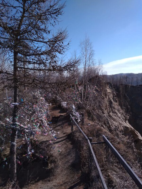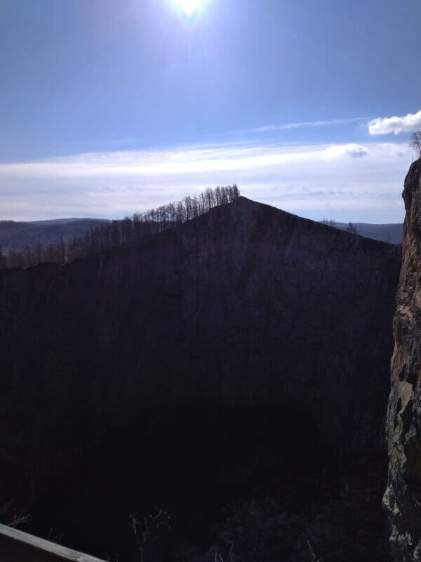 Nie zatrzymujemy się jednak zbyt długo w takich miejscach. Zmierzamy wprost, na szamańską górę, która jak się potem okaźe, jest wzniesieniem z „wydrążoną” dziurą w środku. Wjeżdżamy na sam szczyt. Miejsce jest skomercjalizowane, kupujemy wiec bilety i idziemy w kierunku krateru. W końcu stajemy nad olbrzymią dziurą, na szczycie góry. Stoimy tu przez dłuższą chwilę . Dookoła nas kołyszą się drzewa ustrojone wstążkami. Stojąc tak, próbujżc odkryć tutaj coś niezwykłego, ale wszystko wygląda dość zwyczajnie.